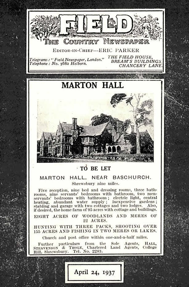 Marton Hall originally stood nearer to the road than the present day hall, adjoining the chapel and stable yard buildings that still remain today. At this time the hall and surrounding estate was owned by the Atcherley family, who resided at Marton for around 250 years. The last Atcherley left the old hall in 1889, after which time the hall was rented out. It was eventually sold to Captain W.S. Gosling in 1911.