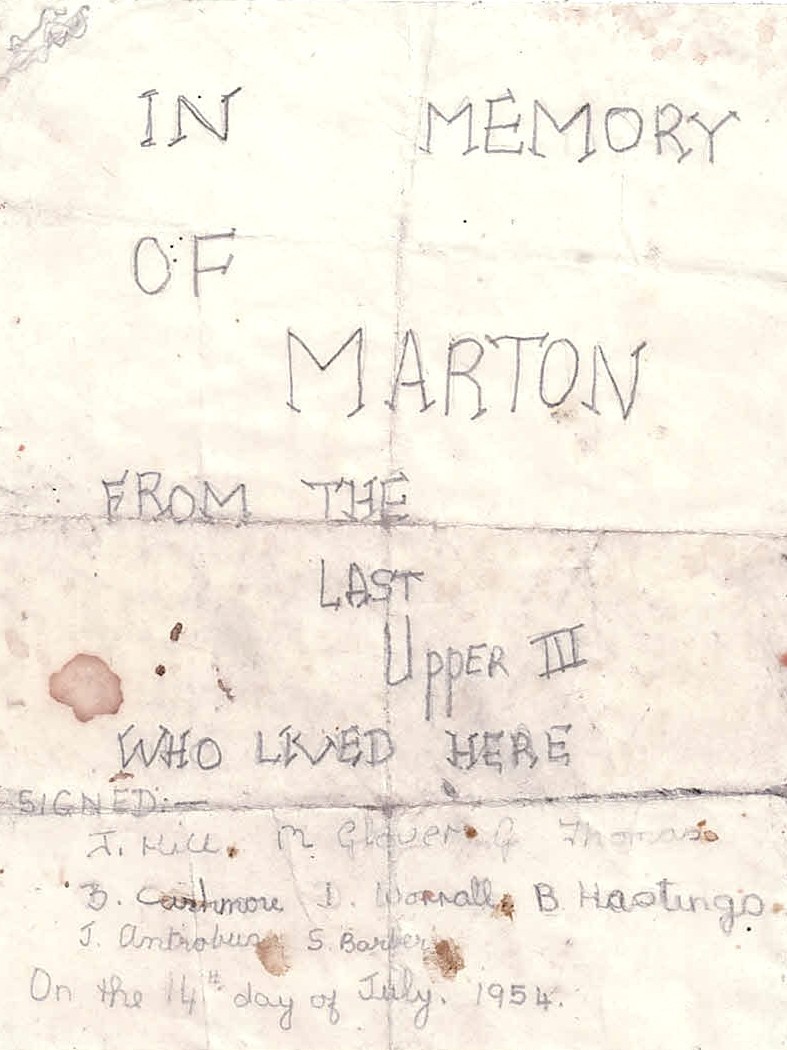 The later part of this period the house’s use changed to that of a school, as did many large houses that survived by reinventing themselves away from being a relic from the past. Recently, we have been told that the hall was first used as a school by evacuees during WWII. Later Marton became the prep school for Adcote Girls School, although the exact year is unknown. The head mistress Doris Gough, (daughter of the school’s founder), still held the tenancy when it was purchased by William (Bill) Gwilt in 1953. Not wishing to purchase the property the prep school relocated to Aston Hall just outside Oswestry in 1954. A note from the “last Upper III” who boarded at Marton was found during the latest renovations up the chimney in the Gwilt bedroom signed by eight girls back in July 1954. It was just after the school relocated that the hall became a family home once more, this time for the Gwilt family.